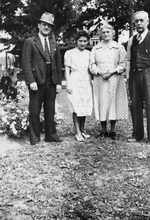 Description :23.1 ARTHUR, SA SOEUR ALMA ET SES PARENTS MARIE ET THEODORE DANS UN JARDIN. 23.2 MARIE ET THEODORE PRES DU MEME ENDROIT. 23.3 LES MEMES, UNE PARENTE ET SON EPOUX AU MEME ENDROIT. 23.4 MARIE ET THEODORE, LA MERE ET LE PERE DU PARENT DE 23.3...