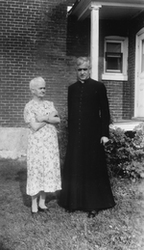 Description :LE FILS EN SOUTANE ET SA MERE, PRES D'UNE MAISON.