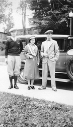 Description :ALMA OLIVIER DEBOUT DEVANT UNE AUTOMOBILE, AVEC DEUX AMIS ENDIMANCHES.