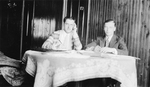 Description :ARTHUR OLIVIER ASSIS AVEC UN AMI, A UNE TABLE AVEC NAPPE.