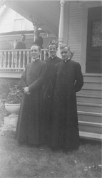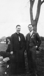 Description :TROIS ABBES EN SOUTANE AU PIED D'UN ESCALIER EXTERIEUR. DE GAUCHE A DROITE, JOSEPH ARCHAMBAULT, LUCIEN BLANCHARD, FRANCOIS OLIVIER.