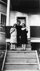 Description :9.1 ALMA OLIVIER EN COSTUME D'ETUDIANTE, AVEC DEUX COPINES, SUR DES MARCHES DE PERRON. ALMA EST AU CENTRE. 9.2 MEMES DEVANT UNE FONTAINE.