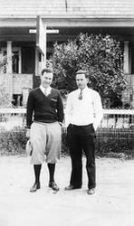 Description :DEUX AMIS DEBOUT DEVANT UNE MAISON.