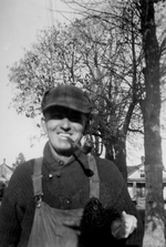Description :M.MOISAN EST PHOTOGRAPHIE A L'EXTERIEUR. A L'ARRIERE-PLAN, ON APERCOIT UNE MAISON QUI SEMBLE ETRE EN BOIS. IL S'AGIT D'UNE PHOTO DE WOTTON
