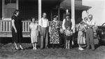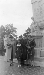 Description :ALMA OLIVIER A DROITE, TROIS FEMMES PARENTES ET UNE ADOLESCENTE, DEBOUT SUR LE PARVIS D'UNE EGLISE OU AUTRE LIEU DE CULTE. PRES D'ALMA SE TROUVE MARIE-LOUISE ARCHAMBAULT-FOISY.