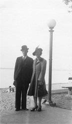Description :UN HOMME ET UNE FEMME ENDIMANCHES DEBOUT PRES D'UN LAMPADAIRE; DERRIERE EUX, UNE PLAGE.