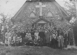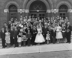 Description :PHOTO DE GROUPE LORS D'UN MARIAGE DEVANT UNE EGLISE.