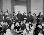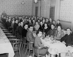 Description :1.1 PLUSIEURS PERSONNES SONT ASSISES A DES TABLES AYANT UN COUVERT DEVANT EUX. 1.2 ON PEUT VOIR LUDGER COUTURE A DROITE SUR LA PHOTO PARMI LES PARTICIPANTS