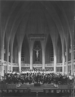Description :CHOEUR DE 150 VOIX. AU CENTRE SYLVIO LACHARITE, DIRECTEUR ENTOURE DES MEMBRES DE L'ORCHESTRE SYMPHONIQUE.