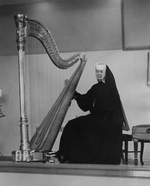 Description :UNE RELIGIEUSE EST ASSISE ET A SA MAIN DROITE POSEE SUR UNE HARPE DEVANT ELLE.