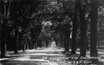 Description :VUE SUR UNE RUE BORDEE D'ARBRES DE CHAQUE COTE. AU CENTRE, AU LOIN, ON VOIT DEUX VOITURES.