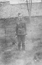 Description :HERBERT ROBINSON, EN UNIFORME DE SOLDAT DE LA PREMIERE GUERRE MONDIALE. IL PORTE A LA MAIN UNE BAGUETTE. EN ARRIERE-PLAN, UN BATIMENT UTILITAIRE.