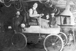 Description :GEORGE FOOTE FOSS EST ASSIS AU VOLANT DE SON INVENTION DANS SON ATELIER. DEBOUT, ENTOURANT LE VEHICULE, TROIS HOMMES: 2 MECANICIENS DONT HERBERT ROBINSON A DROITE ET UN HOMME EN HABIT DE VILLE. DANS L'ATELIER, LE FEU DE FORGE EST A DROITE, DES...
