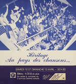 Description :AFFICHE DE PAPIER CARTONNE, IMPRIMEE EN DEUX TONS (BLEU ET BLANC). PARTIE SUPERIEURE DE L'AFFICHE : PHOTO DES MEMBRES DU CHOEUR HERITAGE DANS LES ESCALIERS DU CENTRE CULTUREL DE L'UNIVERSITE DE SHERBROOKE. PRISE DE VUE EN PLONGEE. AU BAS DE L...