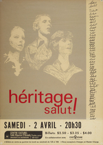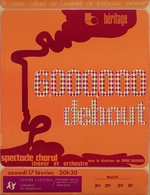 Notes :AFFICHE DU 6E CONCERT DU CHOEUR HERITAGE PRESENTE A LA SALLE MAURICE O'BREADY DE L'UNIVERSITE DE SHERBROOKE (2 AVRIL 1977). LA COPIE NE DONNE AUCUN RENSEIGNEMENT CONCERNANT LIEU, DATE, HEURE ET PRIX, ET LA COLONNE "SALUT" N'APPARAIT PAS.