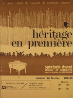 Notes :AFFICHE DU 1ER CONCERT PRESENTE PAR LE CHOEUR HERITAGE A LA GRANDE SALLE DU CENTRE CULTUREL DE L'UNIVERSITE DE SHERBROOKE (26 FEVRIER 1972)