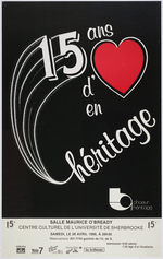Notes :AFFICHE DU 15E CONCERT ANNUEL PRESENTE PAR LE CHOEUR HERITAGE A LA SALLE MAURICE O'BREADY DE L'UNIVERSITE DE SHERBROOKE (26 AVRIL 1986). CONCERT SOULIGNANT LE 15E ANNIVERSAIRE DE FONDATION DU CHOEUR HERITAGE.