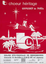 Description :AFFICHE DE CARTON SEMI-GLACE, IMPRIMEE EN DEUX TONS (ROUGE ET BLANC). DESSIN DE LA CRECHE DU CHOEUR HERITAGE (CRECHE FAITE A PARTIR DU SIGLE DU CHOEUR) ENTOUREE DE FLOCONS DE NEIGE. AU BAS DE L'AFFICHE SONT INSCRITS LIEU, DATE, HEURE ET PRIX ...