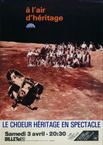 Description :AFFICHE DE PAPIER GLACE, IMPRIMEE EN TROIS TONS (ORANDE, BRUN ET BLEU MARINE). PHOTO-MONTAGE MONTRANT LE CHOEUR HERITAGE SUR LA LUNE.