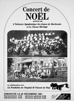 Notes :AFFICHE DU 1ER CONCERT DE NOEL PRESENTE PAR LE CHOEUR HERITAGE A LA SALLE MAURICE O'BREADY DE L'UNIVERSITE DE SHERBROOKE (20 DECEMBRE 1981). CONCERT PRESENTE EN COLLABORATION AVEC LA FONDATION DE L'HOPITAL ST-VINCENT DE PAUL.