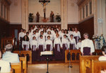 Description :VUE D'ENSEMBLE DES CHORISTES ET DE LA DIRECTRICE MUSICALE, LORRAINE LAPOINTE (A DROITE, FACE AU PUBLIC, DANS LE CHOEUR DE L'EGLISE. PHOTO PRISE DE L'ALLEE CENTRALE, AVANT OU APRES LE CONCERT.