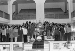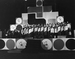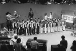 Description :LE CHOEUR HERITAGE PARTICIPE A UNE EMISSION DE TELEVISION (TELE 7) SOULIGNANT LE 1ER FESTIVAL DES CANTONS. 11.1 AU CENTRE DU STUDIO, L'ENSEMBLE DU CHOEUR HERITAGE ENTOURE DES DECORS : MANNEQUINS, RECONSTITUTION D'UNE MAISON, OBJETS (ANTIQUITE...