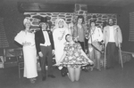 Description :QUELQUES MEMBRES DU CHOEUR, COSTUMES, PENDANT LA REPRESENTATION D'UNE PIECE DE THEATRE AMATEUR. OUTRE MARC BERNIER (DEBOUT, AU CENTRE), LES AUTRES PERSONNES SUR SCENE NE SONT PAS IDENTIFIEES.