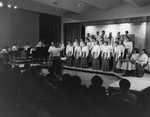 Description :VUE D'ENSEMBLE DES MEMBRES DU CHOEUR : CHORISTES, MUSICIENS (7), DIRECTRICE MUSICALE, LORRAINE LAPOINTE (DOS AU PUBLIC). EN AVANT-PLAN, DANS L'OMBRE, PARTIE DE L'ASSISTANCE (DE DOS) PRESENTE AU CONCERT (20.1). (20.2) MUSICIENS ET CHORISTES, A...