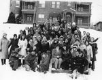 Description :LES MEMBRES DU CHOEUR HERITAGE POSENT ASSIS, AGENOUILLES OU DEBOUT DANS LA NEIGE. PHOTO PRISE AU PARC RACINE (SHERBROOKE) A L'ANGLE DES RUES GILLESPIE ET BALL. EN ARRIERE-PLAN VUE SUR UNE PARTIE D'UNE MAISON DE STYLE CHATEAUESQUE (233 BALL).