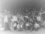 Description :LES MEMBRES DU CHOEUR, DONT 2 AVEC LEUR ENFANT (AVANT-PLAN), POSENT ASSIS PAR TERRE, SUR DES CHAISES OU DEBOUT. QUELQUES-UNS DES MEMBRES (ARRIERE-PLAN), BRAS LEVES ET MAINS TENDUES, SOUTIENNENT LES LETTRES DU MOT "SALUT".
