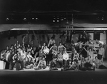 Description :MEMBRES DU CHOEUR, SANS LEUR COSTUME DE SCENE, INSTALLES DANS DIVERSES POSITIONS AU MILIEU D'OBJETS HETEROCLITES (PIANO, ECHELLES, ECHAFAUDAGES, CUBES DE BOIS ETC.), POSENT SUR LA SCENE DE LA SALLE MAURICE O'BREADY. ON REMARQUE QUE LE SYSTEME...