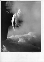Description :M. CLEOPHAS GOSSELIN DEVANT LE TRAIN DE LAVAGE DE LA LAINE BRUTE ("SCOURING TRAIN").