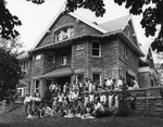 Description :MEMBRES DU CHOEUR, VETUS DE LEUR COSTUME DE SCENE, POSENT DEVANT UN DES BATIMENTS (PAVILLON 1, STYLE ECLECTIQUE) DU DOMAINE HOWARD.