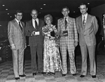 Description :NEIL LONGLADE (A GAUCHE), PRESIDENT DE LA PATON ET RONA BERKIN, GERANT, ENTOURENT LES NOUVEAUX ADHERENTS AU CLUB : NORMAND LEMAY, BERTHA MORIN ET NAPOLEON MARTINEAU.