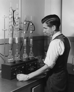 Description :5.1 GILBERT DUFORT, DEBOUT DEVANT DES APPAREILS DE VERIFICATION DU POURCENTAGE D'HUILE DANS LA LAINE. 5.2 GILBERT DUFORT MESURANT LA FINESSE ET LA LONGUEUR DES FIBRES POUR AJUSTER ENSUITE LA DISTANCE ENTRE LES ROULEAUX.