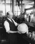 Description :HERBERT BUCKLEY, SURINTENDANT DU TISSAGE, A COTE D'UN ENSEMBLE DE FUSEAUX POUR LE FIL DE TRAME. A L'ARRIERE, UN METIER A TISSER.