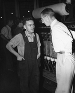 Description :PAUL-EMILE BERTHOLD ET HARRY HORSEFALL (A DROITE) DISCUTENT DEVANT UN METIER A FILER. A L'ARRIERE, ODILON TREPANIER ET UN AUTRE TRAVAILLEUR NON IDENTIFIE.