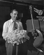 Description :DONAT LEMIEUX, TENANT DE LA LAINE BRUTE DANS SES MAINS PRIS DE LA BOITE D'ALIMENTATION DE LA CARDE.