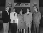 Description :DEVANT UNE AFFICHE ANNONCANT L'EXPOSITION SHERBROOKE TRUST, 1874-1974, UN SIECLE DE CONFIANCE, SONT REUNIS: PAUL-EMILE FORTIER, PHILIP M. ROBINS, YVETTE CAMPBELL, ARTHUR W.KERRIDGE ET FRANCIS W. SMITH.