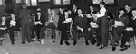 Description :LES CHORISTES, TOUS DES HOMMES, SONT ASSIS ET LISENT LEUR PARTITION. CERTAINS FUMENT. QUELQUES CRACHOIRS SONT DISPOSES AU PLANCHER. CERTAINS HOMMES PORTENT DES GUETRES. DENIS TREMBLAY(?)EST LE QUATRIEME ASSIS A PARTIR DE LA GAUCHE ET PORTE DES...