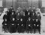 Description :ANCIENS ET NOUVEAUX ELEVES DISPOSES EN EVENTAIL DEVANT LA PORTE DU NOUVEAU BATIMENT.