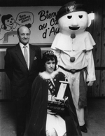 Description :CAMILLE ROUILLARD, LA MASCOTTE DU FESTIVALS ET MARCEL PERREAULT, PHOTOGRAPHIES TENANT LA CLE.