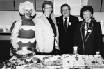 Description :DEUX FEMMES, UN HOMME ET UNE MASCOTTE SONT DEBOUT DEVANT UNE TABLE GARNIE DE NOURRITURE.