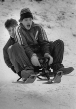 Description :DEUX GARCONS SONT ASSIS SUR UN "TROIS-SKIS" EN TRAIN DE DESCENDRE UNE PENTE. UN GARCON A UNE TUQUE ET L'AUTRE N'EN A PAS.