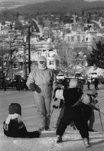 Description :UNE FEMME MONTE LA PENTE A PIED; DEVANT ELLE UN JEUNE ENFANT EST ASSIS DANS LA NEIGE TANDIS QUE DEUX AUTRES A SA DROITE DESCENDENT EN SKI. ON APERCOIT LA VILLE EN PLONGEE.