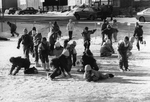 Sujet principal :DES ENFANTS S'AMUSENT A GLISSER SUR LEUR VENTRE DANS LA NEIGE.