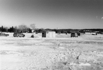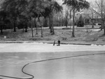 Description :DES EMPLOYES MUNICIPAUX DEBLAYENT LA PATINOIRE TANDIS QU'UN BOYAU D'ARROSAGE LA TRAVERSE. A L'ARRIERE, ON APERCOIT LE PAVILLON 2 DU DOMAINE HOWARD.