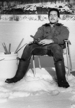 Sujet principal :MICHEL GARAND, PECHEUR SUR GLACE A LA RIVIERE MAGOG.
