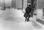 Description :UN HOMME AVEC UN MANTEAU DE FOURRURE EST EN TRAIN DE PELLETER DE LA NEIGE DEVANT UN MAGASIN.