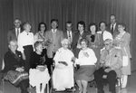 Description :NARCISSE AMIRAULT ET ANDRE CARDINAL EN TRAIN DE COUPER LE GATEAU D'ANNIVERSAIRE. DERRIERE EUX, LES EMPLOYES EN COSTUME D'EPOQUE.